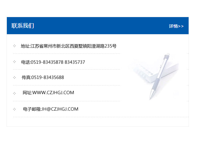 地址:常州市新北區友邦商務大廈1幢16、17層  電話:0519-85101652  傳真:0519-85112595  郵編:213022  網址:www_cz-jiayue_cn.szclener.com  郵箱:xiajifengaa@163.com
